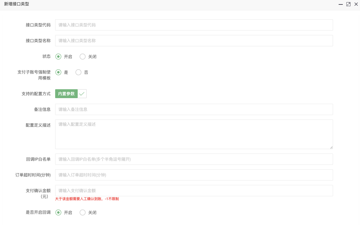 进入:运营平台 > 支付配置 > 支付接口类型 > 新增接口类型