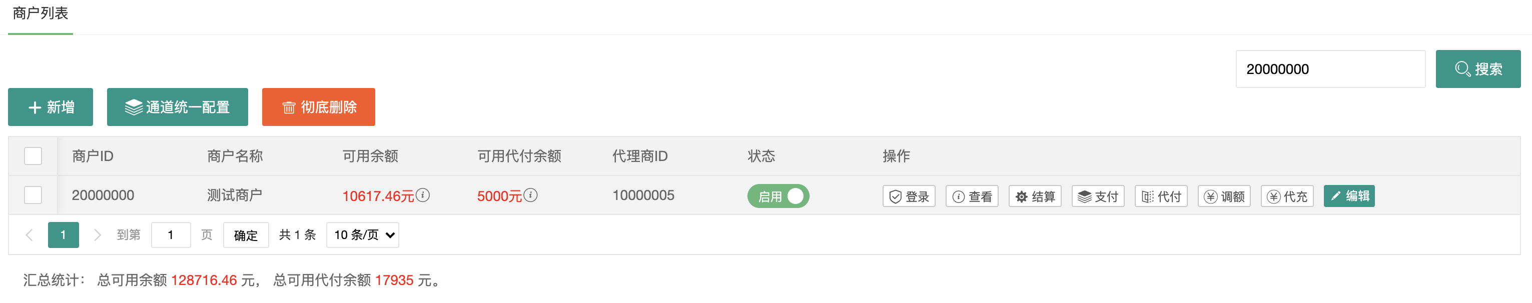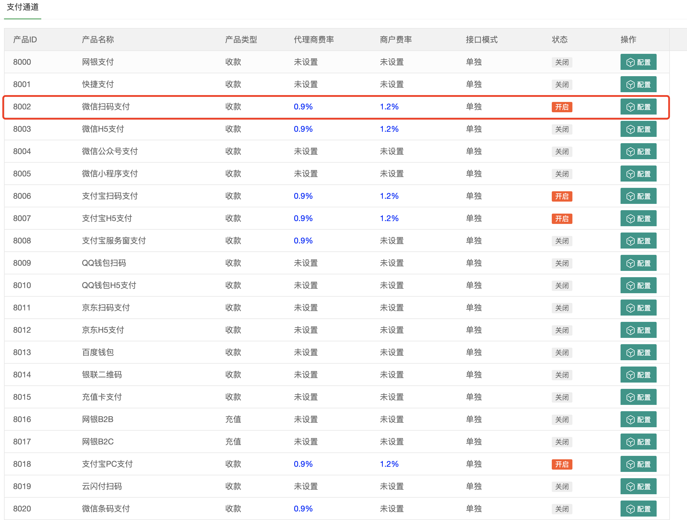 在商户列表操作栏,点击支付为商户配置支付通道,列表中显示平台的所有支付产品,可以为商户设置每个产品的通道和费率。
