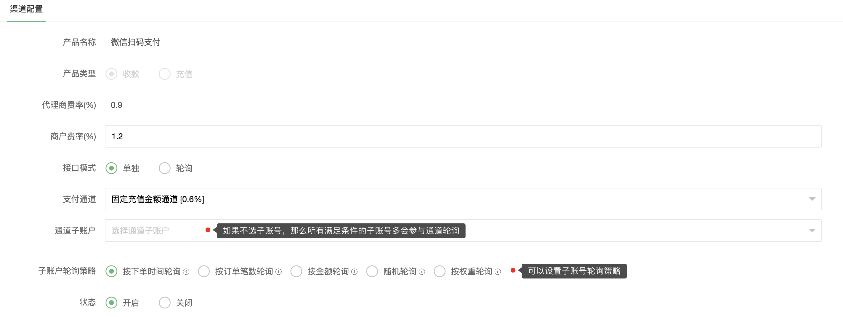 设置单独模式,需要选择支付通道,同时也可以指定通道的子账户(非必须,如果不选子账号,那么通道下所有符合的子账号都参与轮询)。