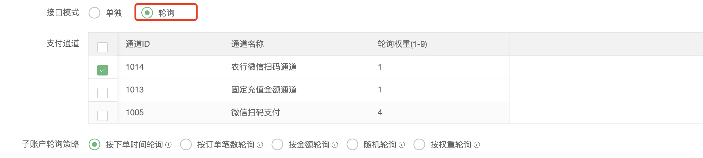 设置轮询模式,可以选择多个支付通道,设置通道的权重。